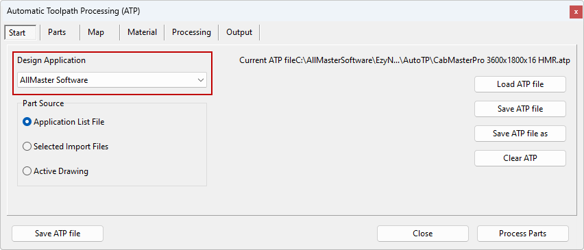 With a design application specified, the parts to process will be loaded from a list file in the Parts tab of the ATP dialog. (The list file is a list of all of the DXF files to be processed, along with additional information such as material, quantity, and rotation for each part).
