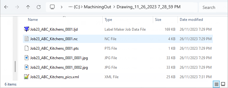 ShapeMaster creates machining files (click on image). Each material used in your drawing will be separated into different folders under the job name, which can be brought into EzyNest for nesting by selecting the .dxt file for the material you want to nest. In this example, Job Name is 'Drawing' and the Material is '18mm new antique white'.