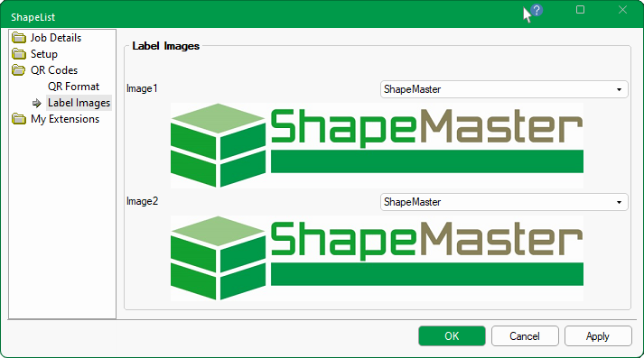 The QR Codes > QR Label Images page allows the selection of up to two (2) logo images that can also be exported and used on machining labels.