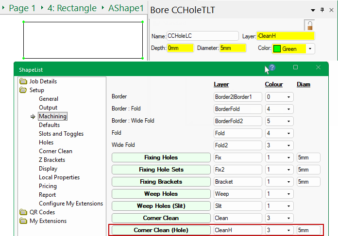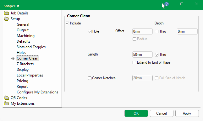 In this example, the Include and Hole checkboxes are enabled as per the Setup > Corner Clean page shown above.