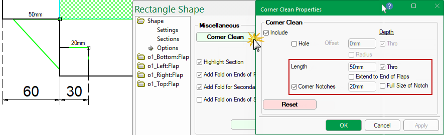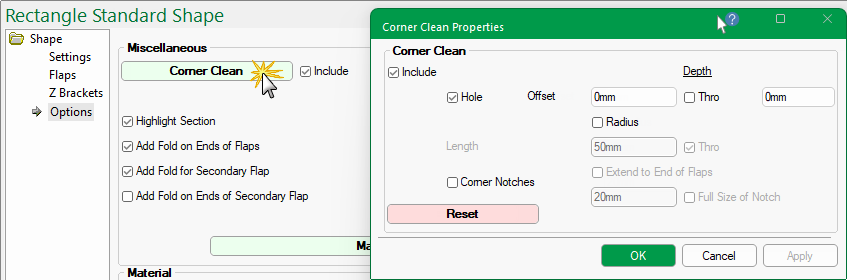 Enable the Corner Clean feature by ticking the Include checkbox.