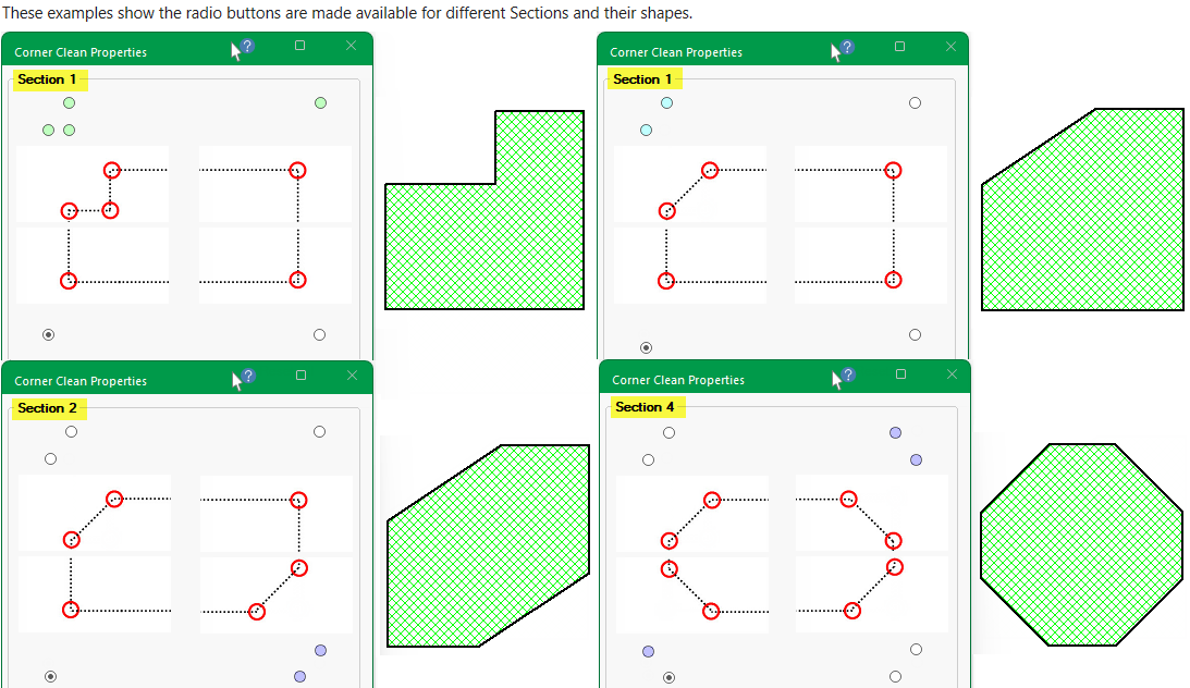 on either the Settings page or the Sections page is provided, allowing you to clean selected corners of each available Section of the shape, which is useful when a corner cutout is applied.