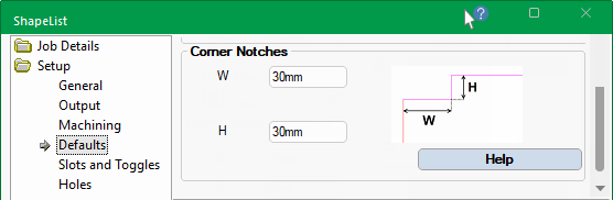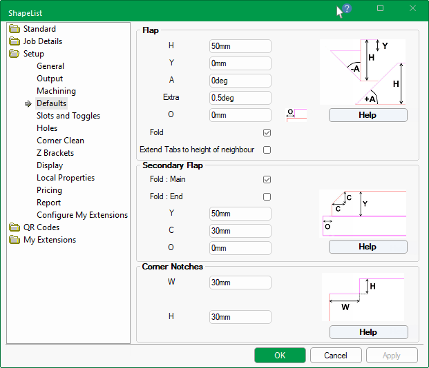 The Setup > Defaults page of the Catalog/Drawing Properties allows you to set the height of flap and notch defaults, as every job/drawing involves different dimensions.