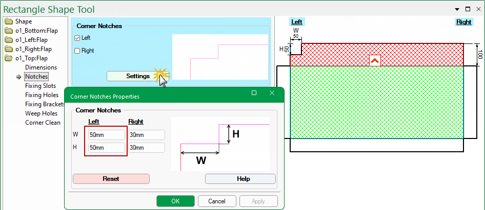 On the required Flap > Notches page of the Shape Properties you can override the default settings, as shown below, for the Left and/or Right of flap.