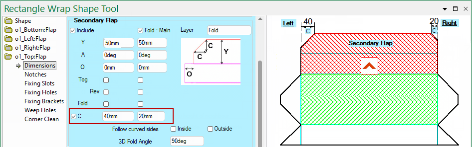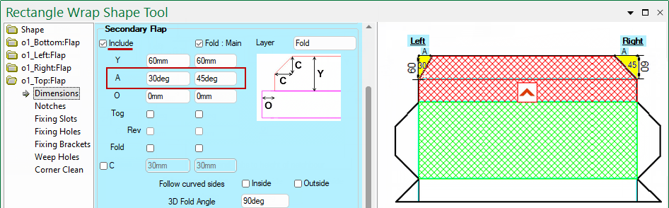 If Include is ticked, you can set the Angle of the secondary flap edge in the Shape Properties.