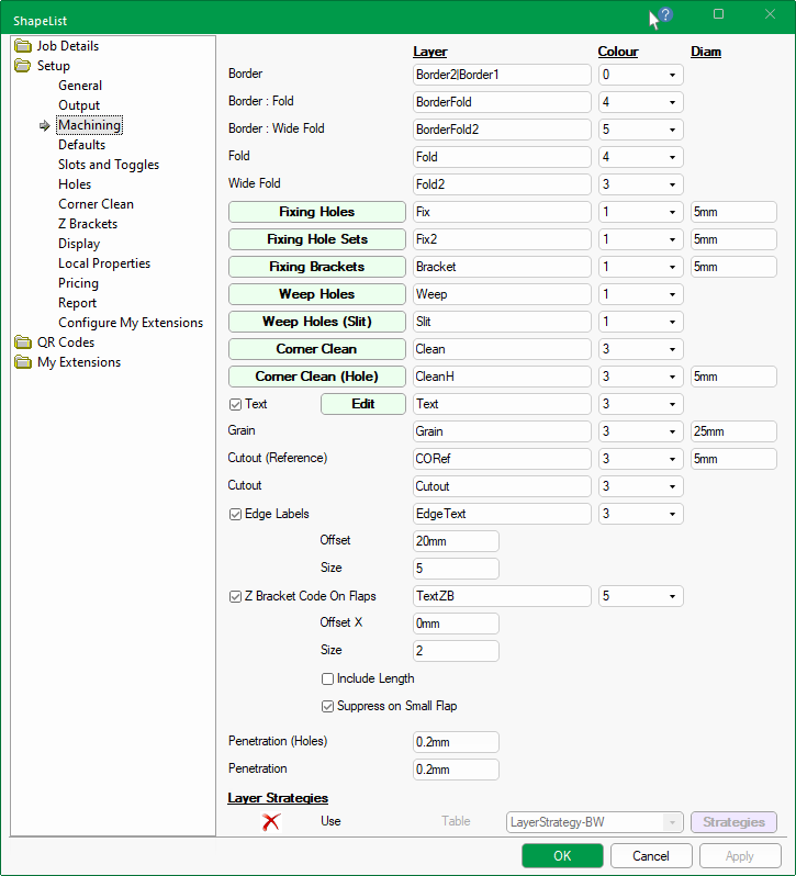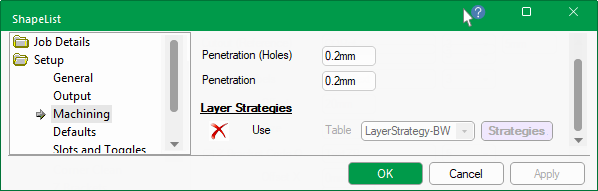 To date CabMaster Software™ has used formulas in the Layers table to define these strategy strings. However, not all layer names are mapped via the Layers table. For example, some come from custom machining tables or are keyed in by the user through the application's machining editor.