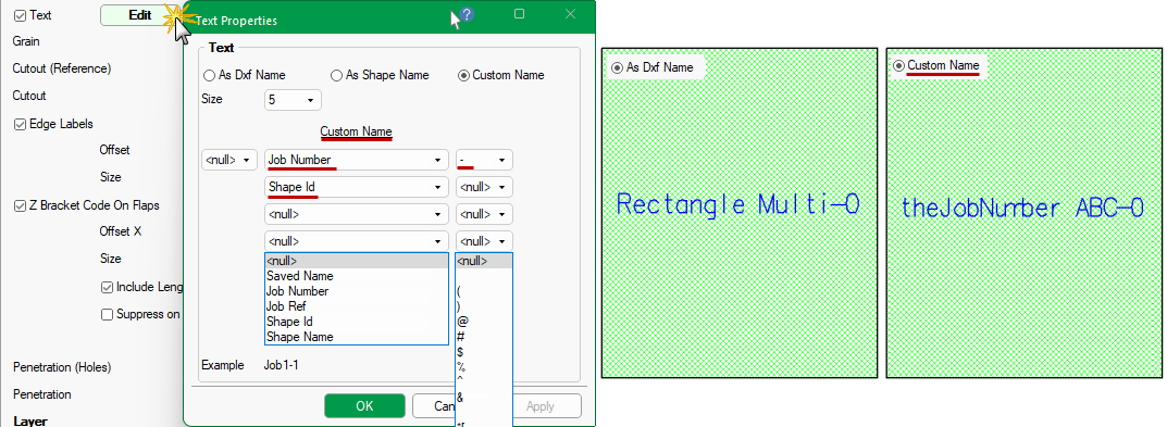 In this example the Custom Name has been used i.e. Job Number plus a dash (-) plus Shape ID (here it is 0 as we are looking at the Tool)