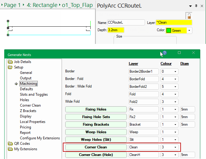 The Corner Clean (Hole) allows you to create a hole on each corner so, in addition to a Layer name, a drill Diameter is required.