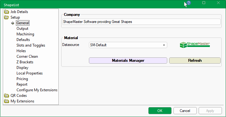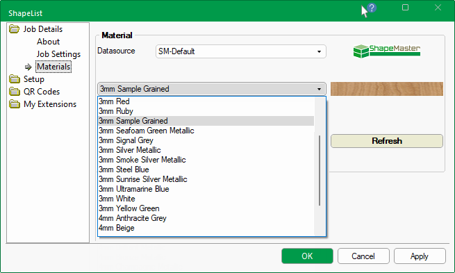 The Materials Manager can only be used when the Datasource is SM-Default (ShapeMaster), so if pricing is required for other Datasources then Fixed pricing can be used - see Pricing Tutorials : Requirements.
