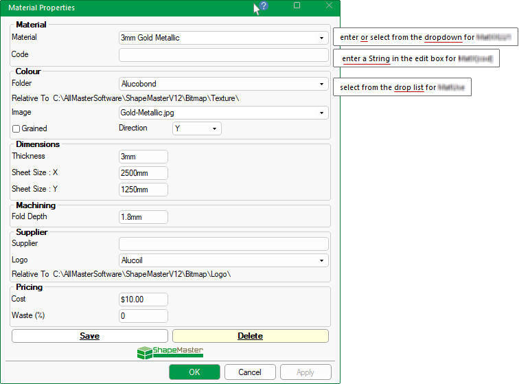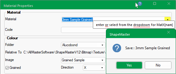 An image of the new material may also be required, which is simply a jpg saved in the stated location/Folder.