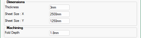 The Dimensions i.e. Material Thickness and Sheet Size, entered here are informational only, as these will be defined in the ATP - see topic on Machining.