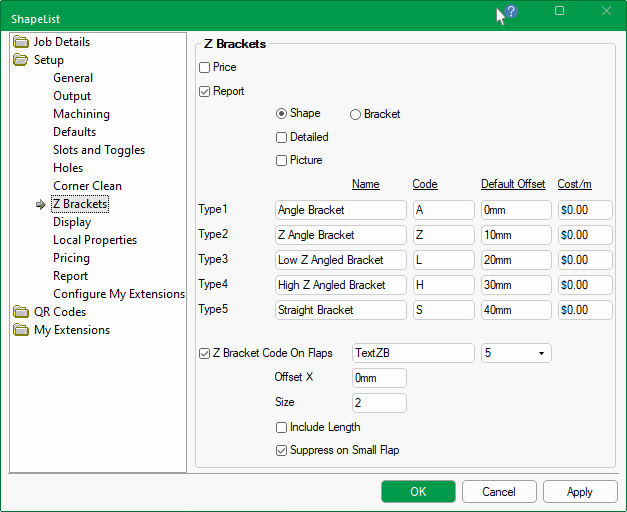 The Setup > Z Brackets page in the Drawing Properties is where up to 5 types of brackets can be set up with costing.
