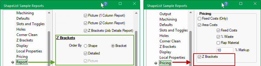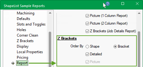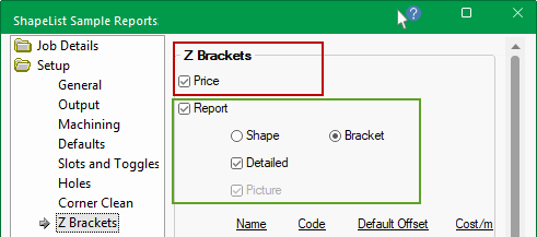 The Setup > Report page and the Setup > Pricing page is a repeat of the report options on the Setup > Z Brackets page.
