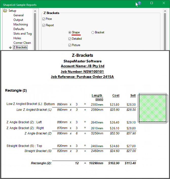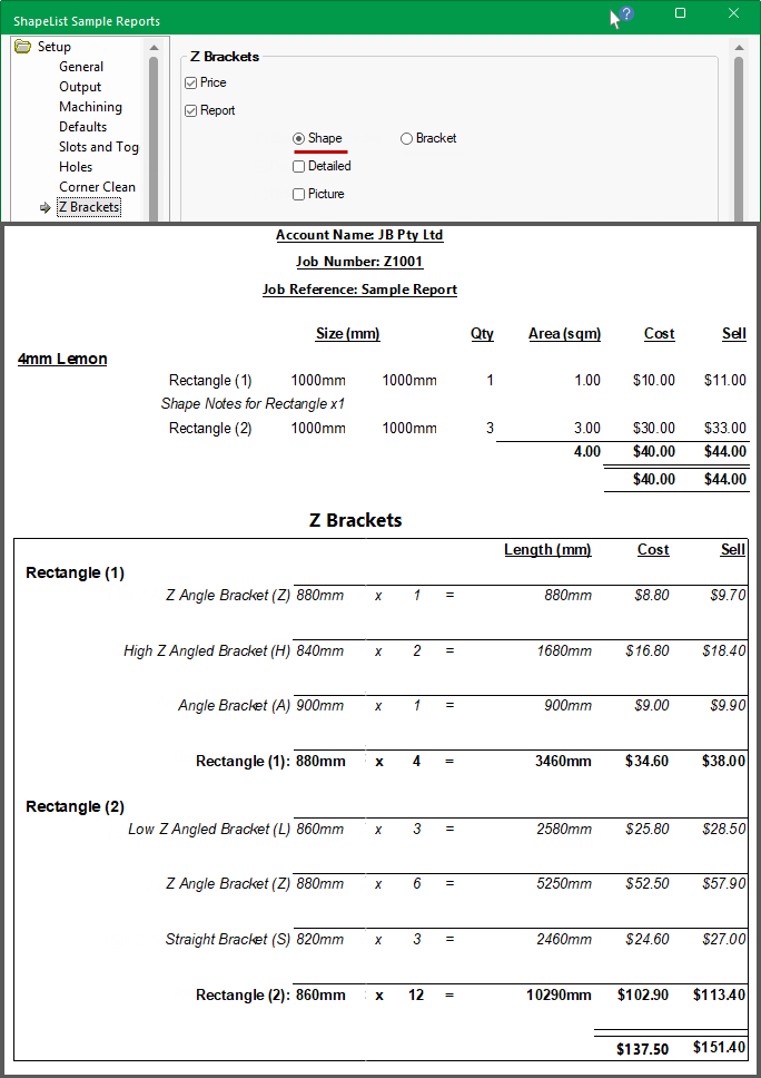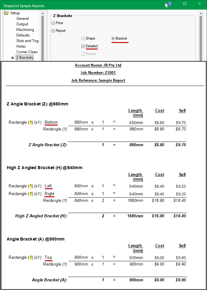 Job Details Report with Z Brackets pricing enabled by Shape and NO details.