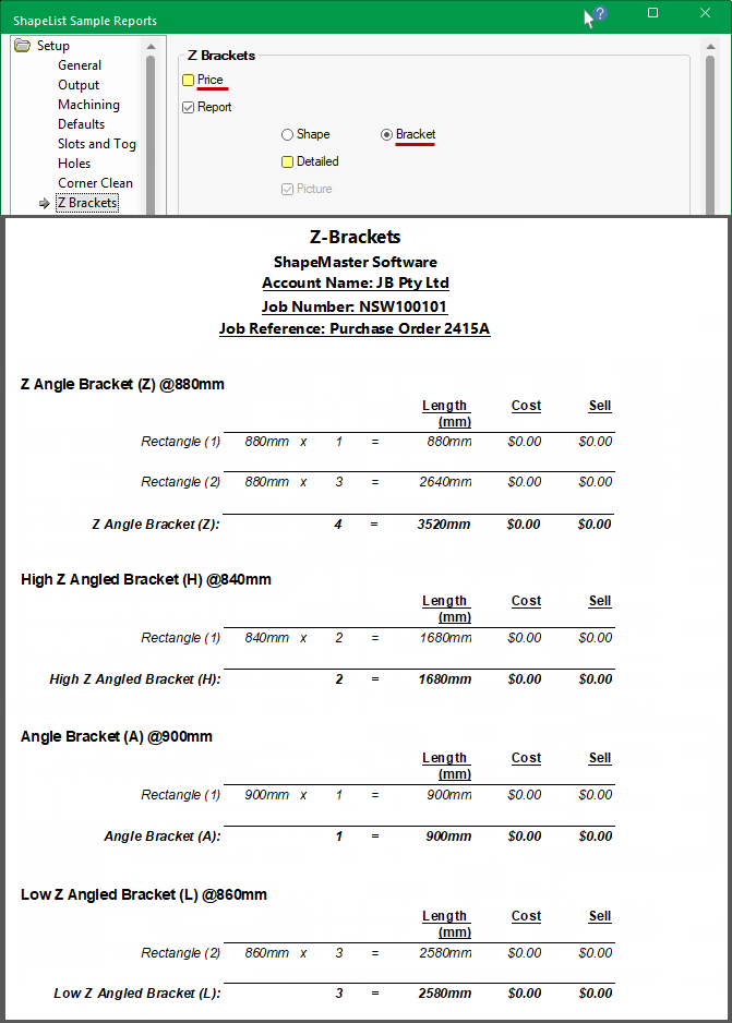 If turned OFF, this has no affect on the Z Brackets Report.Price - Tick to include the Cost pricing on the report.
