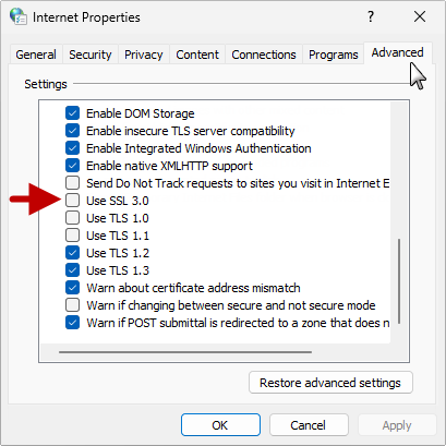 - In Internet Options click on Advanced tab and scroll down to ensure that the current TLS is enabled.