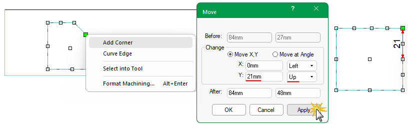 From this we can determine that we need to move the corner by 21mm (i.e. 45mm - 24mm).