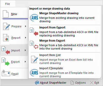Displays a dialog which is very similar to the Open dialog, where you can select an existing drawing file to merge with the current one. This is done in the same way that templates are applied to a drawing, so like templates it allows you to control what happens when answers in the current drawing conflict with those in the drawing being merged in. Refer to Tutorial on Import Item List.