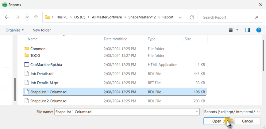 Select the required report (normally sorted under relevant folders) and click 'Open'. Alternatively, simply double click on file name to generate.