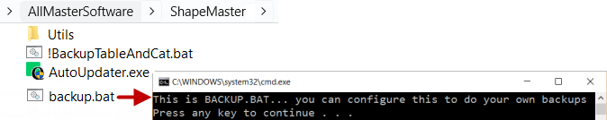 This initiates an end of day backup. It does this by executing the batch file backup.bat in the same folder as ShapeMaster.