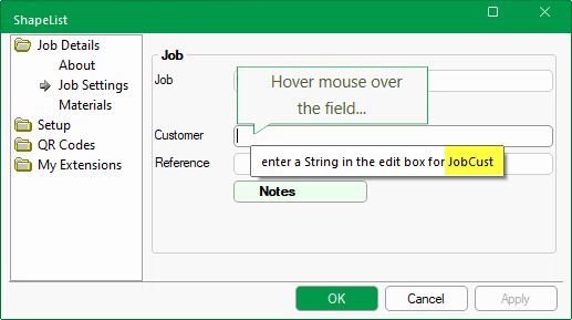 - Then hover the mouse over the field and the variable name required will be displayed, in this case JobCust.