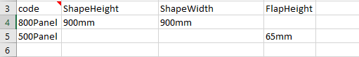 - The first column must always be code as it selects the shape/part required from the library.