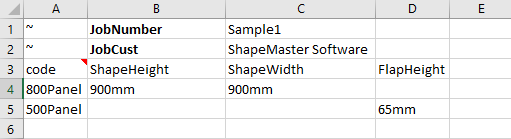 - Subsequent column headings will give the name of the middleware variable (e.g. CabWidth) that will be set by the value provided (e.g. 450mm).