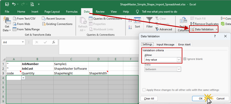- On the Settings tab, under Allow, select Any Value and click OK.