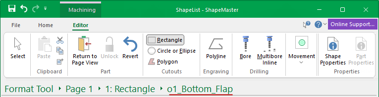 The Machining Editor provides commands for adding new machining and is accessible when you select a shape/item part for machining using the Breadcrumbs Bar.