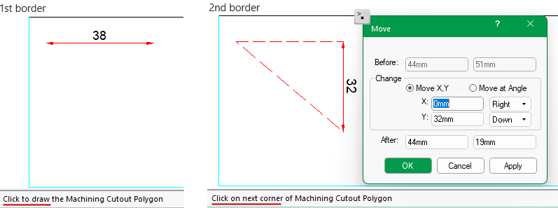 In this example, we first enabled the Polygon tool and used 'Drag to Draw' the cutout to create the 1st border line (the temporary dimension is automatically provided while drawing i.e. 38mm). Then used the Precise Movement Input dialog to created the 2nd border line of the polygon by changing the Move Y by 32mm.