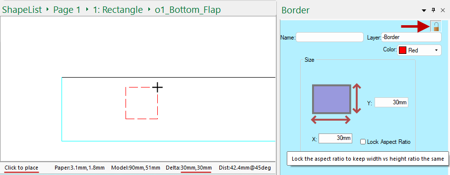 In the following example, the Rectangle Tool has been enabled with 'Drag to Place' and unlocked. The Size has been set to create a 30mm x 30mm square and then, as per the notification, 'Click to place' as required.