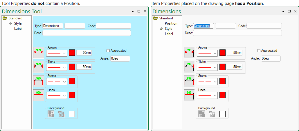 - The Tool properties do not contain a Position, since they do not exist on the drawing page yet.
