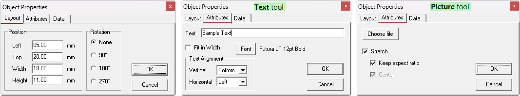 There are three tools to add information to your label designs i.e. the Text tool, Barcode tool and Picture tool...