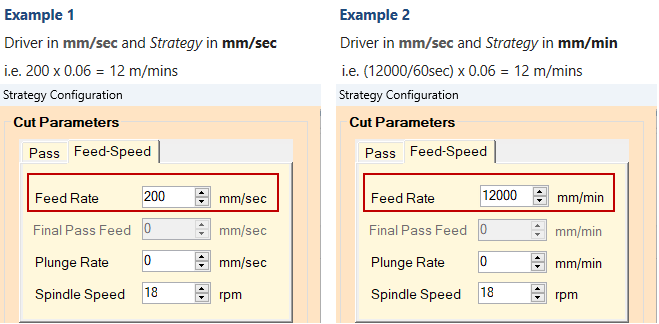 Both the SCM and the Biesse driver (and perhaps others) require GCode in m/min which is NOT one of the available choices. Therefore the driver does a conversion from mm/sec to m/min as per Example 2.