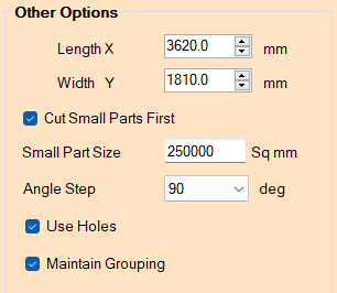 Tick this checkbox if you would like to have small parts cut first. A Small Part is any part that has a surface area that is less than the threshold defined in Miscellaneous Settings.