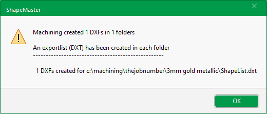 This is a sample of a message generated after the Export Machining or F8 button has been pressed.
