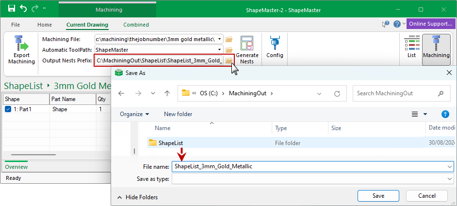 When you press the Export Machining command button, generates CNC files and label files per sheet. The Output Nests Prefix is the text string name at the start of each of these files, helping you to identify the CNC files needed on the machine.