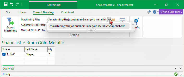 The Machining File drop list allows you to select the machining file (DXT) to nest.