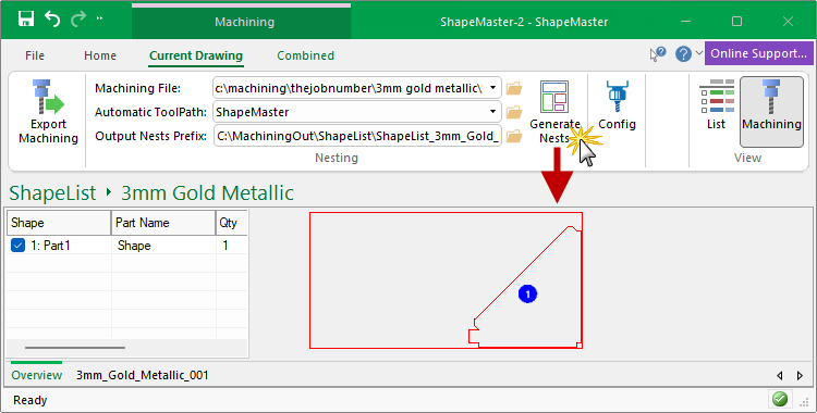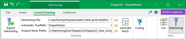 Ensure that the ATP (see Setup) and nesting process is all setup and working manually before you try to run it silently from the Machining View. If everything is setup and running manually, then automating it via the Machining View will be straightforward.