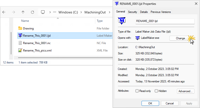 Then in the General tab you will see "Opens with:" use the 'Change' button to go search for the application you want, but do not use the LabelMaker.exe that is already in the suggested list, browse to it again in the EzyNest\AutoTP\Labels folder and apply the change. Then you should see the icon change.