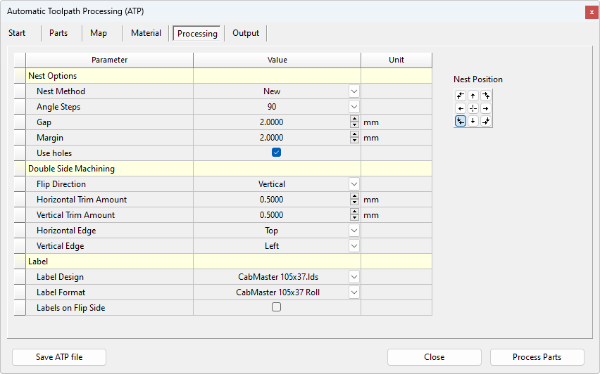 The Labels on Flip Side checkbox allows printing on the flip side when double sided parts are processed.