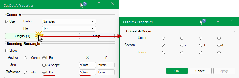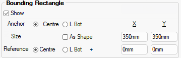 The Show Reference Point option allows you to see where the cutouts are positioned with reference to a given point on the shape, either Centre or L Bot (bottom left).