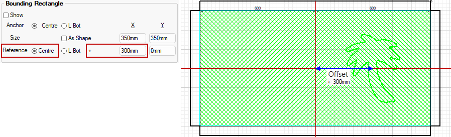 The position of the rectangle (Centre or L Bot) is defined as an Offset from the Reference Point, which in this example is 'Centre'.