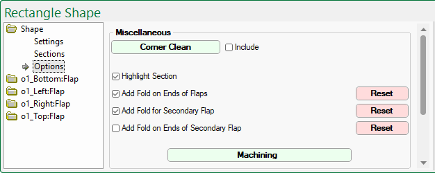 The Corner Clean can be further controlled on individual flaps, thereby overriding the settings on the Shape > Options page discussed above.