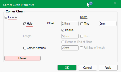 The Offset can be controlled by either entering a required value (e.g. 2.5mm) or by ticking the Radius checkbox, the Corner Clean Hole will use the radius as the offset.