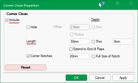 Use the Reset button if you want to reset the values back to the Drawing properties - see Setup Corner Clean.