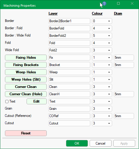 Clicking on the Reset button will reset these options to defaults set in the Drawing properties - See Setup Machining.