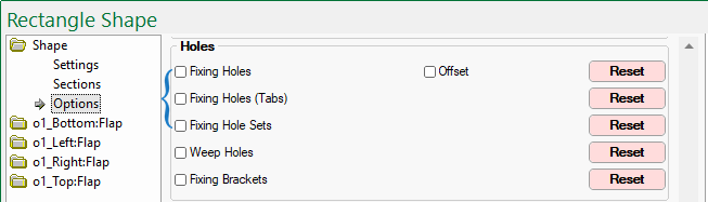 The Setup > Holes page of the Drawing Properties allows you to place securing holes around the edges of the tabs on shapes.