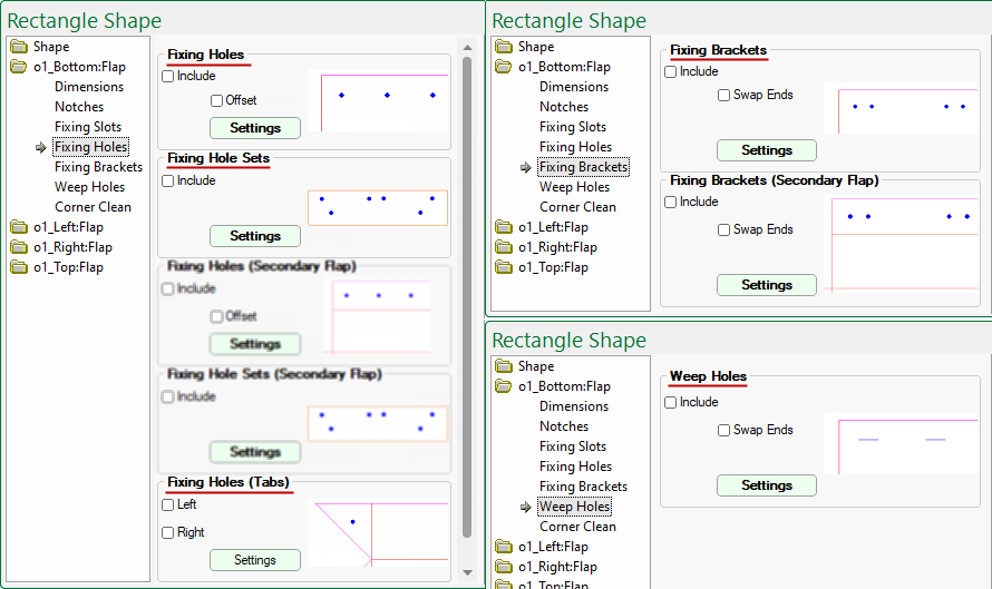 The presence and location of holes can be edited by using the applicable Settings buttons provided.