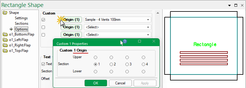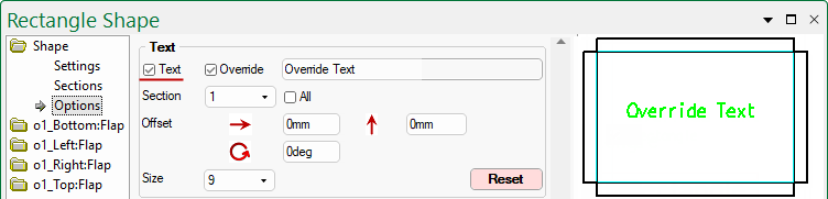 Override the defaults set on the Shape > Options page by selecting the required Flap > Dimensions page.